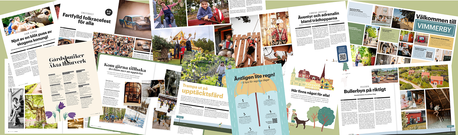 Läs vårt digitala turistmagasin och upptäck allt som Vimmerby har att erbjuda. Här hittar du information om besöksmål, evenemang, utflyktsmål och smultronställen. Utforska vandringsleder och cykeläventyr, njut av badplatser och besök våra bästa restauranger.