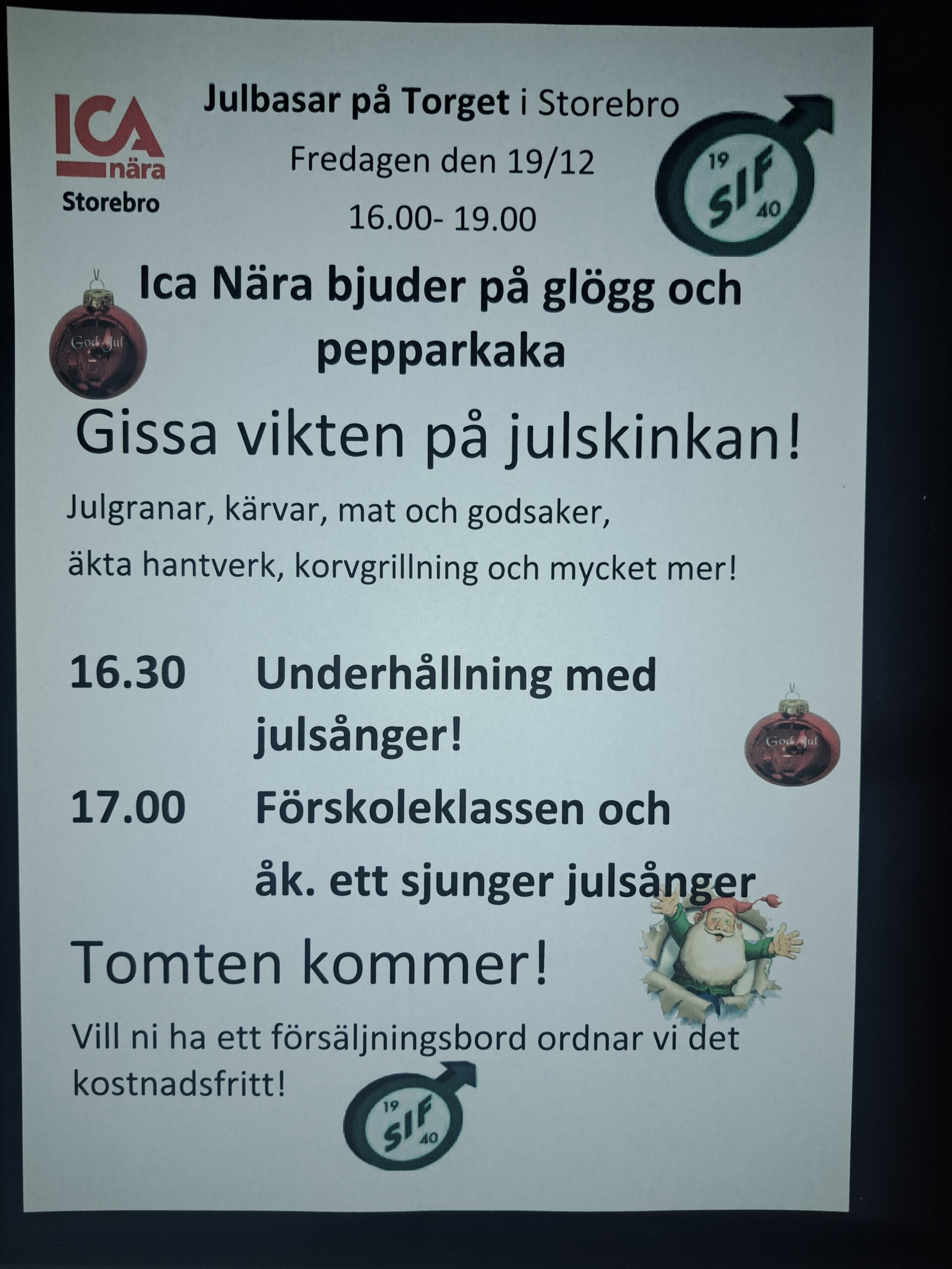 Julbasar där tomten bjuder på godis, man kan gissa vikten på skinkan och vinna den. Ica nära bjuder på glögg och pepparkakor.