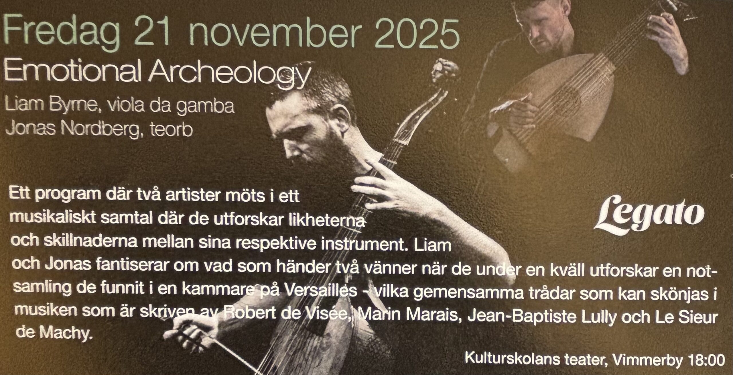 Liam Byrne (viola da gamba) och Jonas Nordberg (teorb) fantiserar om vad som händer två vänner när de under en kväll utforskar en notsamling de funnit i en kammare på Versailles. Musik av Lully, Marais mm.