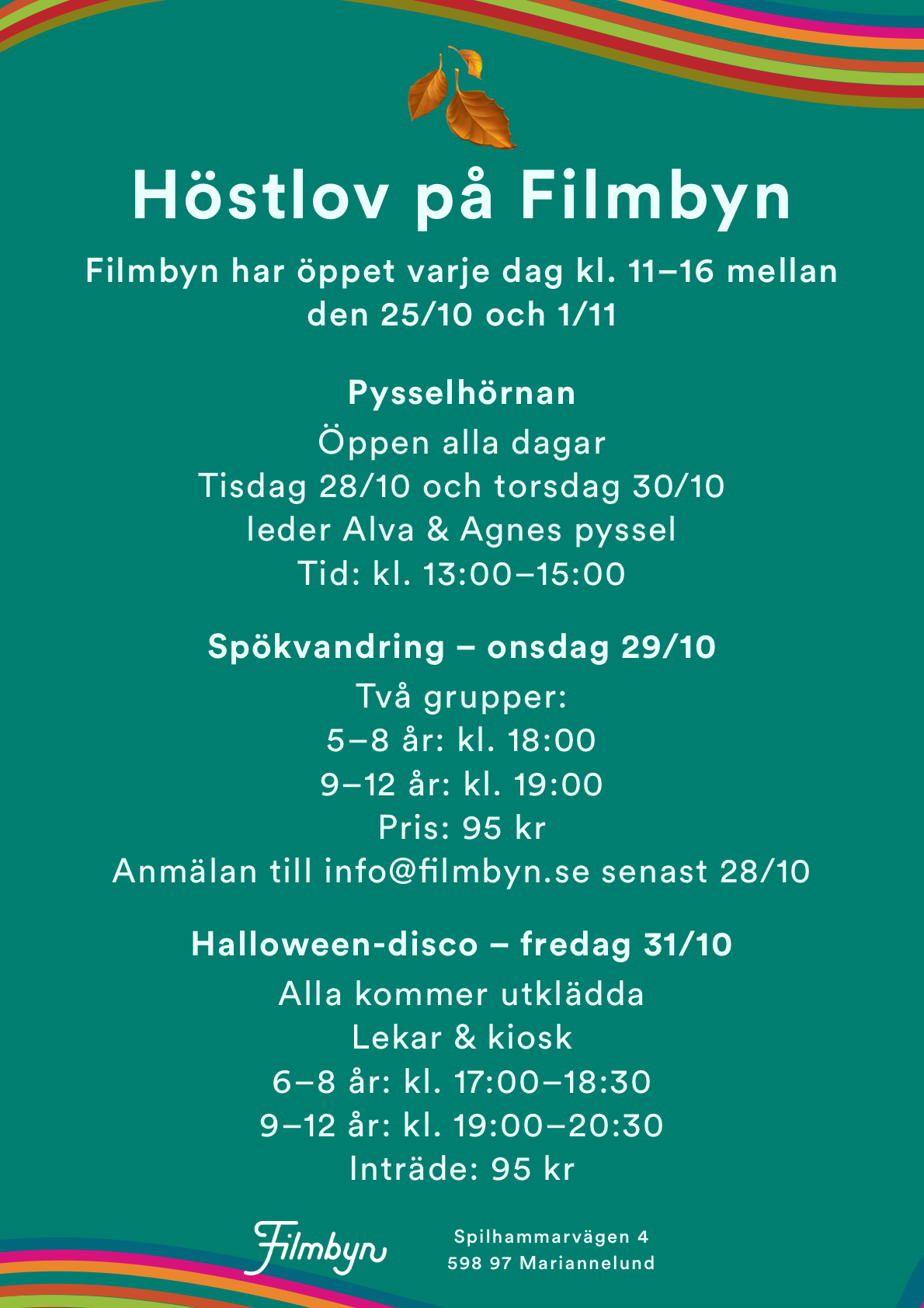Filmbyn Småland Spilhammarvägen 4, Mariannelund, Eksjö kommun, SverigeVecka 44 är det höstlov o vi erbjuder pysselhörna för alla hela veckan. Spökvandring på onsdagen och disco på fredagen.