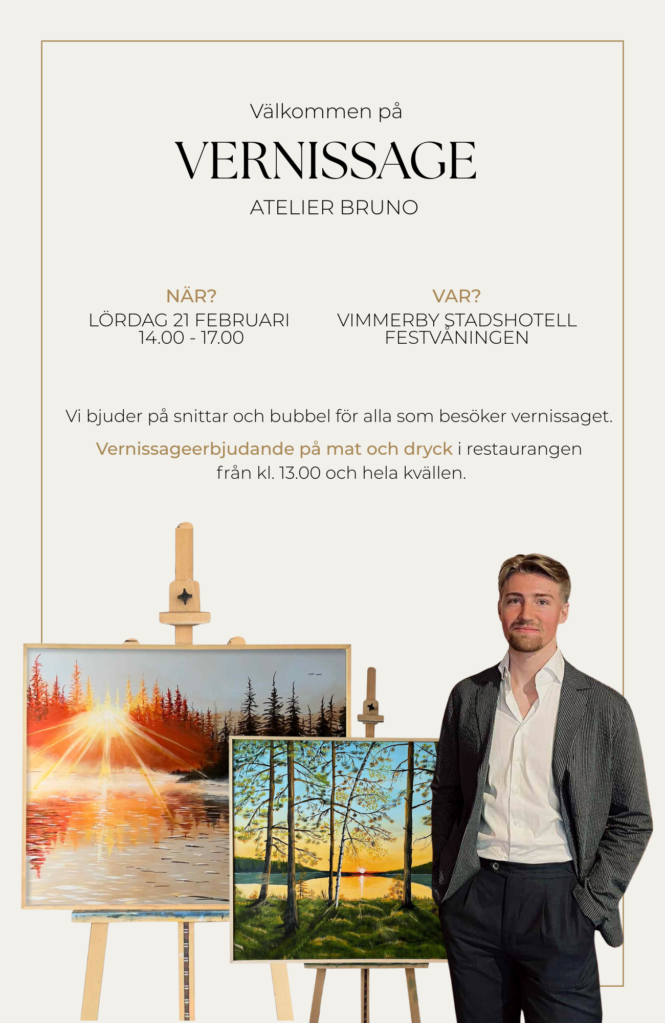 Vimmerby Stadshotell Stora Torget 9, Vimmerby, Kalmar länLördagen den 21 februari kl. 14.00-17.00 bjuder vi in till vernissage med Bruno Robin Bruno Christoffersson i festvåningen på Vimmerby Stadshotell. Robin är målvakt i Vimmerby Hockey och även en uppskattad konstnär. Alla som besöker Robins vernissage bjuds på snittar och bubbel. Alla besökare får dessutom 15% rabatt i restaurangen.