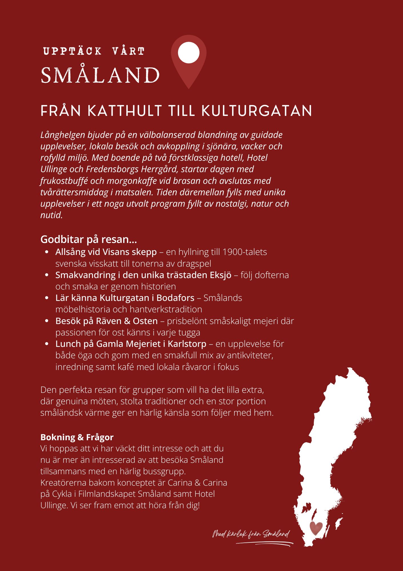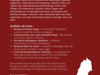 Upptäck vårt Småland är namnet på ett helt nytt erbjudande för bussresor och grupper som vill lära sig mer om Småland. Paketet innehåller en hel strut av småländska karameller, både mjuka och hårda. För mer information besök hemsidan!