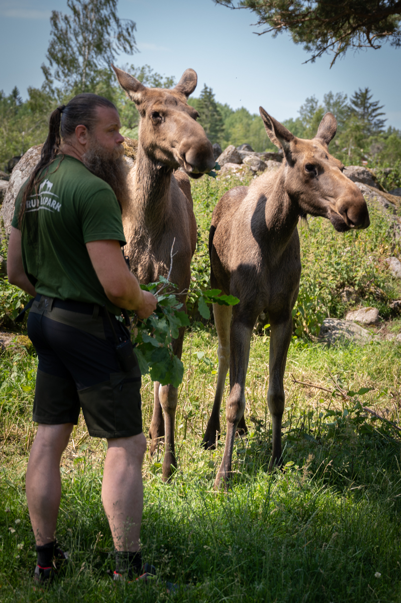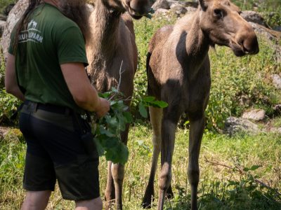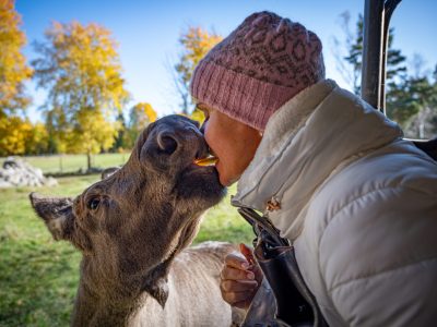 Det bästa sättet att möta parkens mäktiga älgar är att följa med på en guidad safaritur rakt in i parken. Från safarivagnarna, som har tak och delvis öppna sidor, kommer ni riktigt nära djuren, ofta så nära att ni kan både klappa och mata dem. Ibland blir mötet så nära att någon av de nyfikna älgarna vill hälsa lite extra… och kanske till och med bjuda på en klassisk älgpuss!